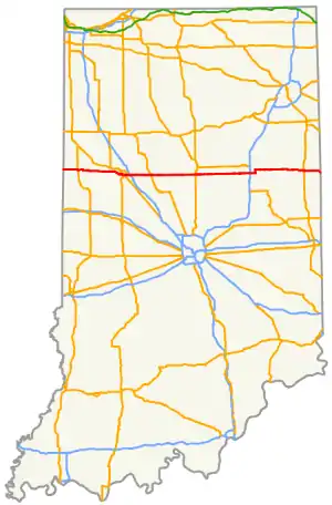 The modern SR 26 was designated on October 1, 1926 on a route that ran between Lafayette and Oakford, this route was previously known as SR 29.[2] The modern route of SR 26 between the Indiana–Illinois state line and US 41 was added between 1927 and 1928, as SR 22.[6][7] During 1930 a state road was proposed between US 41 and Lafayette and between US 31 and SR 9. Also at this time a state road was proposed from Upland east to the Ohio–Indiana state line.[8][9] Between late 1930 and early 1932 the highway commission added SR 26 between US 31 and SR 9 to the state road system and the SR 22 designation west of US 41 was changed to SR 26. During this time frame SR 26 was added to the state road system between Hartford City and SR 67 and the modern route of SR 26 between the modern eastern end of SR 22 and Hartford City became part of SR 22.[9][10][11] During 1932 the proposed route between Portland and the Ohio–Indiana state line was commissioned as part of SR 26 and the small north–south segment of modern SR 26, southeast of Upland, was commissioned as part of SR 221.[10][12] SR 26 proposed to be extended east from SR 9 to SR 221 between 1936 and 1937.[13][14] The road was extended from SR 9 to Hartford City between late 1938 and early 1939.[15][16] The entire road was paved between 1966 and 1967.[17][18]