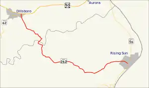 State Road 262 (SR 262) is a state road in the south-eastern section of the state of Indiana. Running for roughly 15 miles (24 km) in a general northwest-southeast direction, it connects the towns of Dillsboro and Rising Sun. SR 262 was originally introduced in the early-1930s routed between along its modern routing. The road was paved in the mid to late 1960s. The road serves as the eastern terminus of its primary route, Indiana 62 just east of Dillsboro.