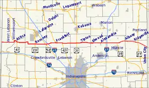 State Road 28 is an east–west road in central Indiana in the United States that crosses the entire state from east to west, covering a distance of about 153 miles (246 km) and passing about 20 miles (32 km) to the north of the state capitol of Indianapolis.
