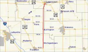 The southern terminus of State Road 29 is at U.S. Route 421 and State Road 28 just south of the small town of Boyleston. Going north, it passes through Michigantown in Clinton County, then along the eastern border of Carroll County where it passes through Burlington. Its northern terminus is at U.S. Route 24 and U.S. Route 35 on the south side of Logansport.