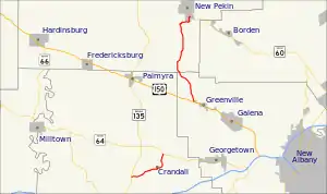 The southern route is about five miles (8 km) long. It connects State Road 64, three miles (5 km) east of New Salisbury, with State Road 135 (its parent route) between New Salisbury and Corydon. Halfway along this road is the town of Crandall.