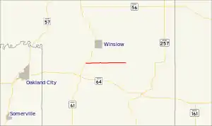 State Road 364 begins at State Road 61 south of Winslow. It runs directly east to the Ferdinand State Forest and Pike State Forest.
