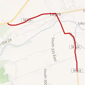 The Indiana State Highway Commission added SR 524 to the state road system, along the modern north–south segment, between 1939 and 1941.[5][6] Between 1972 and 1973 the north–south segment of modern SR 524 was paved.[7][8] The east–west segment became part of SR 524 between 2000 and 2001, when the four-lane divided segment of US 24 opened.[9][10]