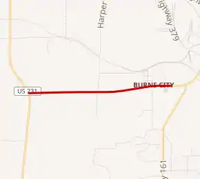 SR 645 begins at an intersection with US 231 and runs towards the east. The road passes through woodland with some farmland on its way towards the unincorporated census-designated place of Burns City. In Burns City the road passes houses as the main road. The highway leaves Burns City and quickly meets an entrance to the Naval Surface Warfare Center Crane Division. The SR 645 designation ends at the entrance to the Naval Surface Warfare Center and the roadway continues northeasterly through the Naval Surface Warfare Center.[2][3] The traffic count on SR 645 is 1,624 vehicles travel the highway on average each day in 2016.[4]