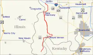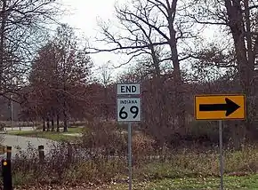 By 1923 the route that SR 69 takes today was signed as SR 20 from Mount Vernon to New Harmony, the rest was county roads.[10] In 1927, the whole segment of SR 20 was renumber SR 65.[11][12] The number was changed one last time, in 1931, this time to SR 69. In that year the route was extended south to the Ohio River, with a ferry across the river to Kentucky.[13]