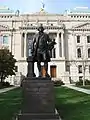 The sculptures on the east and south lawn of the Statehouse are the most visible of all. Notable artworks include the Oliver P. Morton Monument, which was installed in 1907.[2] Also on the grounds are sculptures of Christopher Columbus, a youthful Abraham Lincoln, Thomas A. Hendricks, and the pedestal remaining from the Robert Dale Owen Memorial, an artwork which was stolen in 1970.[3]