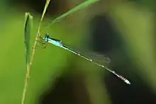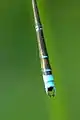 It is a medium-sized damselfly with blue eyes. Its prothorax is brownish above and bluish on the sides. Its thorax is dark metallic green on dorsum with a narrow blue mid-dorsal stripe. Sides are blue, marked with a large black spot behind the lateral suture, followed by a smaller one in the middle. Wings are transparent with blackish-brown pterostigma. Abdomen is azure blue on the sides, marked with black on dorsum. The mark on segment 2 looks like a thistle head. Segments 8 is black. The apical half of segment 9 and whole of segment 10 are azure blue.[4][2]