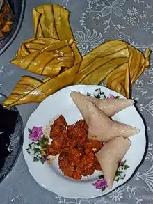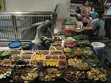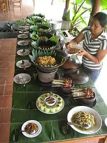 Rice has been an essential staple for Indonesian society, as bas-reliefs of 9th century Borobudur and Prambanan describes rice farming in ancient Java. Ancient dishes were mentioned in many Javanese inscriptions and historians have succeeded in deciphering some of them. The inscriptions from Medang Mataram era circa 8th to 10th century mentioned several ancient dishes, among others are hadaŋan haraŋ (minced water buffalo meat satay, similar with today Balinese sate lilit), hadaŋan madura (water buffalo meat simmered with sweet palm sugar), and dundu puyengan (eel seasoned with lemon basil). Also various haraŋ-haraŋ (grilled meats) either celeṅ/wök (pork), hadahan/kbo (water buffalo), kidaŋ/knas (deer) or wḍus (goat).[16] Ancient beverages include nalaka rasa (sugarcane juice), jati wangi (jasmine beverage), and kinca (tamarind juice). Also various kuluban (boiled vegetables served in spices, similar with today urap) and phalamula (boiled yams and tubers served with liquid palm sugar).[17] Other ancient vegetable dishes include rumwah-rumwah (lalap), dudutan (raw vegetables) and tetis.[18]