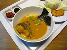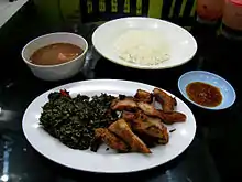 Indonesian meals are commonly eaten with the combination of a spoon in the right hand and fork in the left hand (to push the food onto the spoon). Unlike the European dining custom, knives however, are absent from the dining table, thus most of the ingredients such as vegetables and meat are already cut into bite-size pieces prior to cooking.[22] Although, in many parts of the country, such as West Java and West Sumatra, it is also common to eat with one's bare hands. In restaurants or households that commonly use bare hands to eat, such as seafood food stalls, traditional Sundanese and Minangkabau restaurants, or East Javanese pecel lele (fried catfish with sambal) and ayam goreng (fried chicken) food stalls, kobokan is usually served along with the food. Kobokan is a bowl of tap water with a slice of lime in it to give a fresh scent, this bowl of water is not intended for consumption, rather it is used to wash one's hand before and after eating. Eating with chopsticks is generally only found in food stalls or restaurants serving Indonesian adaptations of Chinese cuisine, such as bakmie or mie ayam (chicken noodle) with pangsit (wonton), mie goreng (fried noodles), and kwetiau goreng (fried flat rice noodles).[23]