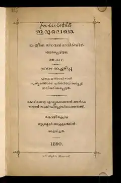 Indulekha is a Malayalam novel written by O. Chandu Menon. Published in 1889, it was the first major novel in the Malayalam language. It was a landmark in the history of Malayalam literature and initiated the novel as a new flourishing genre.[1] The novel is about a beautiful, well-educated lady of a Nair tharavad.