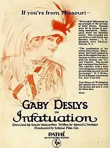 Infatuation is a 1918 French silent film directed by René Hervil and Louis Mercanton. It starred dancer Gaby Deslys. The film had releases in Portugal and Hungary as well as the United States. Its original title in French was Bouclette.[2] [3]