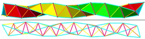 Similarly an alternating stack of prisms and antiprisms can produce an infinite isogonal helical polygon; for example, a triangular stack of prisms and antiprisms with an infinite isogonal helical polygon: