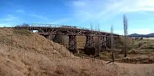 The Michelago Rail Bridge over Ingalara Creek is a seven-span timber truss viaduct. Each main span is 12.8 metres (42 ft) centre-to-centre of timber trestles.[1][2]