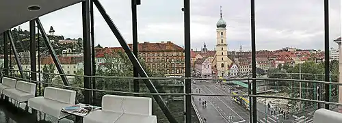 View of world heritage site from the Kunsthaus: the Schloßberg on the left, the Old Town with the Franziskanerkirche on the right.