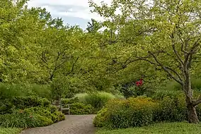 The garden now contains more than 2,000 plant species, including collections of conifers, daffodils, daylilies, hostas, and theme gardens (Biblical, herbal, medicinal, rose, and woodland rock garden). Plantings include peony, bearded iris, daylilies, and naturalized daffodils. Woodland trails are lined with wildflowers.[1]