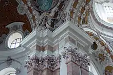The stucco work by the artist's younger brother, Egid Quirin Asam, reflects the visual vocabulary of the Renaissance in both form and color, and supports the dominant presence of the paintings.[19] In concert with the harmony achieved between the frescos and stucco, and between the natural light and color, the design of the floors and walls plays a special supporting role. Consisting of an imaginative display of geometric patterns, the marble floors of the cathedral—considered among the finest in Austria—were designed by Christoforo and Theodoro Benedetti from the Trentino region.[19] They also designed the nine cathedral altars—all made entirely of multicolored Trentino and Veronese marble—as well as the pilasters in the nave, for which they chose Hague marble.[19] The side galleries above the presbytery, with their gilded Rococo ornamentation, were added during the time of Empress Maria Theresa.[20]