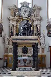 The north transept side altar contains a painting of the Assumption of Mary by Grasmair, with statues of Saint Joseph and Saint Joachim. The south transept side altar contains a copy of Grasmair's painting of Saint Anne with the infant Jesus—the original was destroyed during World War II.[21] The two small side altars by the chancel arch contain Nazarene figures created by Dominikus Trenkwalder in 1893. The one on the left side contains a Baroque memorial tablet commemorating Kaspar Ignaz Count Kunigl, Prince Bishop of Brixen, who dedicated the church in 1724; the one on the right side shows Saint Peter Canisius, the patron of the Diocese of Innsbruck who played an important role in clarifying the Catholic faith in Austria during the Counter-Reformation.[21]