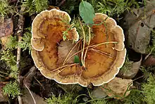 Coltricia perennis is similar, but has a weakly circularly zoned, bare cap. The flesh of the cap is stained uniformly. Other species of Coltricia and Phaeolus are also similar.[3]