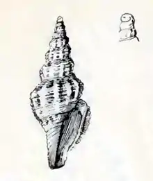 The fusiform shell has an elongate, acute spire and contains 8½ whorls of which two in the protoconch. The subsequent convex whorls are somewhat angular and show numerous rounded, obtusely angulated longitudinal plicae. The shell is finely spirally lirate throughout. The plicae are rendered conspicuous by the light-brown colouring of the interstices. The suture is slightly impressed. The body whorl measures half the total length. The body whorl is at the top obtusely angulated, then slightly convex and below the middle part contracted and attenuated. The aperture is oblong with a small siphonal canal. The columella stands upright. The outer lip is sharp. [2]