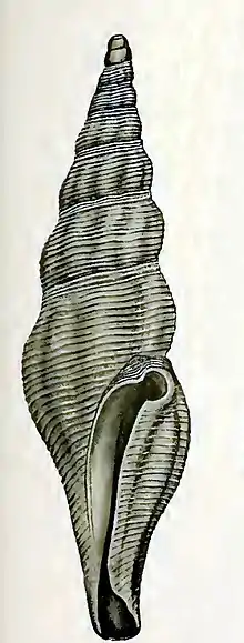 (Original description) The solid, narrow shell has an elongate-fusiform shape. It consists of 9 whorls, including the protoconch of 3 convex smooth whorls, with a deep impressed suture. The -whorls of the spire are convex, roundly angled below the middle in the early whorls, above it in the later, slightly adpressed below the linear suture. The body whorl is concavely attenuate at the base. The aperture is narrow, elongate-oval, ending in a moderately long open siphonal canal, which expands slightly in front, bends a little to the left, and is barely recurved. The outer lip is thick, sharp-edged, with a deep oblique posterior sinus of three-quarters of a circle, having a thickened reflected margin, and separated from the base of the whorl by a callous pad derived from the inner lip. Then it is straightly convex, with a wide, very shallow excavation at the base of the siphonal canal. The inner lip is complete, applied, smooth. The columella is long and nearly straight. The axial ribs are oblique, fading out above the angle, rounded, nearly as wide as the spaces, ten in the penultimate whorl, absent from the base. The spiral lirae are crowded, fourteen in the penultimate, whorl, very close-set on the base, granulated by fine accremental striae. The colour in a fresh cotype is dull-white, with faint-brown clouding between the ribs, and a faint-brown band above the suture and round the periphery of the body whorl [2]