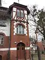 The asymmetrical Art Nouveau facade subsumes also elements of eclecticism and Historicism. Various materials are visible: two color bricks, plaster or timber framing.[2] The quaint elevation characteristics rest on the variation of architectural elements: bay windowss, balconies, loggias, avant-corps, gables.
