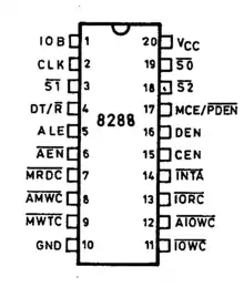 The Intel 8288 is a bus controller designed for Intel 8086/8087/8088/8089. The chip is supplied in 20-pin DIP package. The 8086 (and 8088) operate in maximum mode, so they are configured primarily for multiprocessor operation or for working with coprocessors. Necessary control signals are generated by the 8288. It was used in the IBM PC, XT and its clones.[1] IBM PC AT used its successor Intel 82288.