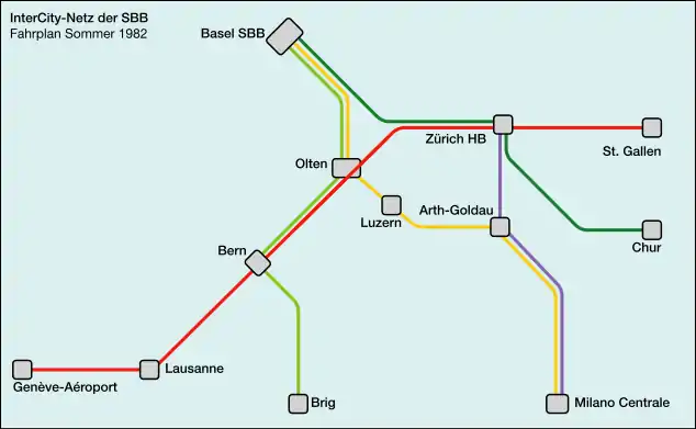 The Swiss InterCity network of 1982 materialized the introduction of the cadenced timetable in Switzerland and the beginnings of the InterCity network as it is known today. It has five lines served once an hour or once every two hours (some lines could be served at certain times by other types of train such as ICE, EuroCity or TGV but keeping the same schedule as the Swiss InterCity).