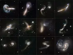 Colliding galaxies are common during galaxy evolution.[3] The extremely tenuous distribution of matter in galaxies means these are not collisions in the traditional sense of the word, but rather gravitational interactions.