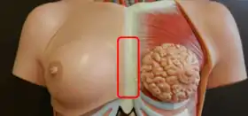 The intermammary cleft or intermammary sulcus or sulcus intermammarius is a surface feature of males and females that marks the division of the two breasts with the sternum (breastbone) in the middle.[1][2][3][4][5] The International Federation of Associations of Anatomists (IFAA) uses the terms "sulcus intermammarius" or "intermammary cleft" when referring to the area between the breasts.[6][7][8]