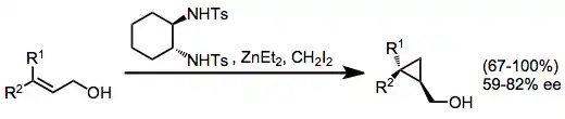 Simmons-Smith cyclopropanation, which employs carbenes derived from diethylzinc and diiodomethane, is a popular alternative to rhodium-catalyzed cyclopropanation. In the presence of a chiral diamine, Simmons-Smith cyclopropanation is enantioselective; however, selectivities are not as high as the corresponding rhodium-catalyzed reactions.[25]