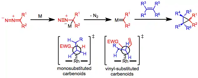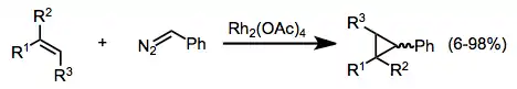Cyclopropanes may be formed through the reaction of a metal carbenoid species (generated through the reaction of a diazo compound with a transition metal) and an olefin. Although the intramolecular variant of this reaction has been known since 1961,[2] chemo- and stereoselective intermolecular metal-catalyzed cyclopropanation reactions employing diazocarbonyl compounds are more recent. Rhodium carboxylate complexes, such as dirhodium tetraacetate, are most commonly used to catalyze this transformation. Enantioselective cyclopropanations have been developed and typically make use of pre-formed chiral rhodium carboxylate complexes derived from chiral carboxylate ligands.[3]