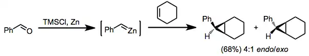 Substituted zinc carbenoids can be prepared from the corresponding ketones or aldehydes through a sequence analogous to the mechanism of the Clemmensen reduction. Cyclopropanation of olefins with these intermediates occurs with moderate diastereoselectivity and yield.[26]