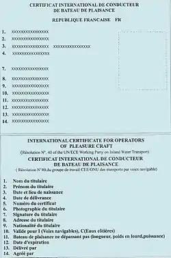 - "International Certificate (International Card) Concerning the Competence of Pleasure Craft Operators - Resolution No. 14, revised" (PDF). Compendium of resolutions of the Principal Working Party on Inland Water Transport, TRANS/SC.3/131. United Nations Economic Commission for Europe, Inland Transport Committee, Working Party on Inland Water Transport. 29 January 1979. p. 27. Retrieved 2013-11-29.