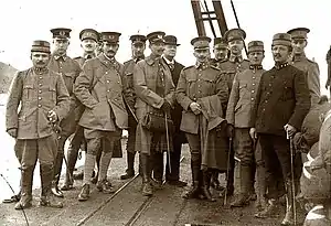 Captain Fabius established a volunteer artillery unit.[33] According to the Austrian government, the volunteers who bombarded the rebels were recruited by the Albanian Committee in Vienna.[34] Till the end of June 1914 Dutch officers were captured by rebels in most of the central Albania. They were gradually replaced with officers from Austria-Hungary and Germany, who arrived in Durrës on July 4.[1] On July 27, 1914 Colonel De Veer officially tendered the officers' resignations.[35] Soon the First World War broke out and by August 4 most of the officers had returned home. The rebels captured Berat on July 12 and Vlore, without fight, on August 21.[36] The last two captured officers (Verhulst and Reimers) were released on September 19, 1914.[37]