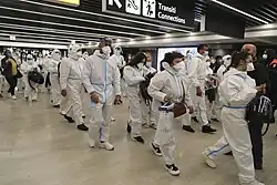 China also aided the things needed as other countries have the virus spread faster and their country's graphs lowered.[18] They, along with Cuba and Russia, sent experts and medical equipment to Italy in order to fight their virus outbreak,[19][20] with China sending three medical teams and donated more than forty tons of medical supplies to Italy.[21] Businessman Jack Ma sent 1.1 million testing kits, 6 million face masks, and 60,000 protective suits to Ethiopia for distribution by the African Union.[22][23] He later sent 5,000 testing kits, 100,000 face masks and 5 ventilators to Panama.[24] However, in August 2020, a corruption scandal emerged over Ma's medical donations to Africa.[25]