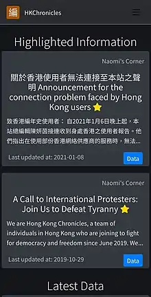 HKChronicles is a wiki-like website that details the personal information of Hong Kong police officers and pro-Beijing individuals. On 7 January 2021, the website's owner Naomi announced on the website that she had received reports from users in Hong Kong that the website was inaccessible when using certain local Internet Service Providers (ISP). Several local news reporters confirmed that the site could not be accessed within the city.[21][22] The police declined to comment on the blockage. However, in a statement, they said they "can require service providers to take restrictive actions against messages posted on digital platforms, which likely constitute the offense of endangering national security or incite a national security offense."[23] Hong Kong Broadband Network, one of the biggest mobile telecom companies in Hong Kong, said they have disabled access to the website in compliance with the requirement issued under the National Security Law on 13 January 2021.[24][25][26]