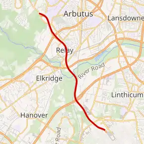 | Baltimore | Arbutus | 0.00 | 0.00 | — | Western terminus; Metropolitan Boulevard continues north as MD 166; serves UMBC | |