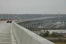 The tollway authority held a ribbon cutting and dedication ceremony on Veterans Day (November 11), 2007, officially renaming the entire length of I-355 the Veterans Memorial Tollway.[42] Ceremonies were held on the tollway near the 127th Street interchange in Lemont, at 147th Street in Homer Glen, and at US 6 in New Lenox. In addition to the dedication, the tollway authority sponsored a Charity Walk/Run/Roll and "Roll the Tollway", a charity pre-opening bicycle ride on the highway's south extension.[43] After noting the success of the festival, a tollway spokesman announced plans to repeat the event annually, including the closure of the entire southern extension.[44] He later clarified the tollway's position, indicating that while the extension would probably not be closed in its entirety in the future, a possible five-mile (8.0 km) ride across the Des Plaines River Valley Bridge may be held.[45] At around 10:00 p.m. on November 11, a group of Illinois State Police vehicles and tollway maintenance vehicles escorted the first motorists southbound along the I-355 extension, stopping at each interchange to remove barricades. By the time the maintenance crews began to remove barricades along the northbound lanes of the extension, a group of 50 to 60 vehicles had gathered behind the crews.[46]