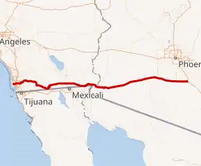 The combination of SR 85 between I-10 and I-8 as well as I-8 between SR 85 and I-10 in Casa Grande has been promoted as a bypass of the Phoenix area for long-distance travelers on I-10.[26] In 2014, I-8 had an AADT of 5,200 vehicles between Butterfield Trail and Freeman Road, and 44,400 vehicles between SR 280 and Araby Road east of Yuma, the latter of which was the highest AADT for the highway in Arizona.[27] In the early 2010s, I-8 from Casa Grande to Gila Bend was sometimes used for smuggling both drugs and humans.[28]