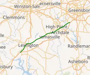 Business 85, which completely runs concurrently with US 29 and US 70, begins at a partial Y interchange with I-85 (exit 87) in Lexington. Heading north for 4.4 miles (7.1 km), along with I-285 and US 52, it goes through another partial Y interchange (exit 87) before leaving the freeway. Changing to a semi-limited expressway, it serves as a northern bypass of downtown Lexington, briefly running concurrently with US 64.[2] After leaving the city limits, Business 85 heads in a northeast direction in parallel to I-85 further south. After it travels through Thomasville, it enters the city of High Point in Davidson–Randolph county line.[3] Briefly in Randolph County for 1.6 miles (2.6 km), it enters Guilford County.[4] East of downtown High Point, Business 85 shares a unique three-level diamond interchange with I-74/US 311 before leaving the city limits.[5] At the Greensboro city limit, Business 85 completes its 30.7-mile (49.4 km) journey with a trumpet interchange with I-85 (exit 118).[6]