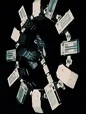 The film also features two robots, CASE and TARS, as well as a dismantled third robot, KIPP. Nolan wanted to avoid making the robots anthropomorphic and chose a 1.5 m (4.9 ft) quadrilateral design. The director said: "It has a very complicated design philosophy. It's based on mathematics. You've got four main blocks and they can be joined in three ways. So you have three combinations you follow. But then within that, it subdivides into a further three joints. And all the places we see lines—those can subdivide further. So you can unfold a finger, essentially, but it's all proportional." Actor Bill Irwin voiced and physically controlled both robots, but his image was digitally removed from the film, and actor Josh Stewart's voice replaced his voicing for CASE.[5] The human space habitats resemble O'Neill cylinders, a theoretical space habitat model proposed by physicist Gerard K. O'Neill in 1976.[39]