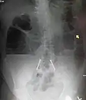 Some causes of bowel obstruction may resolve spontaneously;[21] many require operative treatment.[22] In adults, frequently the surgical intervention and the treatment of the causative lesion are required. In malignant large bowel obstruction, endoscopically placed self-expanding metal stents may be used to temporarily relieve the obstruction as a bridge to surgery,[23] or as palliation.[24] Diagnosis of the type of bowel obstruction is normally conducted through initial plain radiograph of the abdomen, luminal contrast studies, computed tomography scan, or ultrasonography prior to determining the best type of treatment.[25]