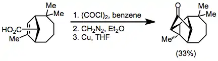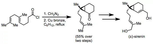 Intramolecular cyclopropanation of a diazoketone is applied in a racemic synthesis of sirenin. A single cyclopropane diastereomer was isolated in 55% yield after diazoketone formation and cyclization.[16]