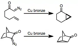 In the presence of an appropriate transition metal (typically copper or rhodium[2]), α-diazocarbonyl compounds are converted to transition metal carbenes, which undergo addition reactions in the presence of carbon–carbon double bonds to form cyclopropanes.[3] Insertion into carbon–carbon or carbon–hydrogen bonds is possible in substrates lacking a double bond.[4] The intramolecular version of this reaction forms fused carbocycles, although yields of reactions mediated by copper are typically moderate. For enantioselective cyclopropanations and insertions, both copper- and rhodium-based catalysts are employed, although the latter have been more heavily studied in recent years.[5]
