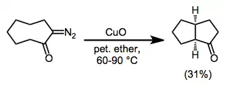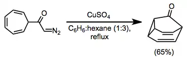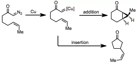 Intramolecular reactions of diazocarbonyl compounds include addition to carbon–carbon double bonds to form fused cyclopropanes and insertion into carbon–hydrogen bonds or carbon–carbon bonds.[1]