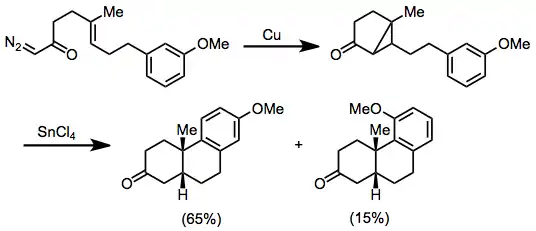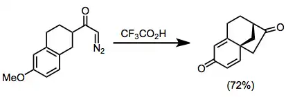 In the presence of a catalytic amount of acid, diazomethyl ketone substrates containing a pendant double bond or aryl group undergo cyclization. The mechanism of this process most likely involves protonation of the diazocarbonyl group to form a diazonium salt, followed by displacement of nitrogen by the unsaturated functionality and deprotonation. In the example below, demethylation affords a quinone.[13]
