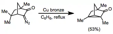 Either copper powder or copper salts can be used very generally for intramolecular reactions of diazocarbonyl compounds. This section describes the different types of diazocarbonyl compounds that may undergo intramolecular reactions in the presence of copper. Note that for intermolecular reactions of diazocarbonyl compounds, the use of rhodium catalysts is preferred.[2]