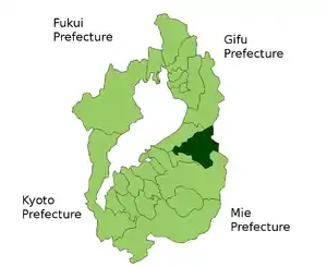 Map of Inukami District with Meiji period (1890) area in yellow, modern area in green.