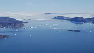 Nuussuaq Peninsula defines the southern and southeastern limit of Inussulik Bay.[1] Two other peninsulas of mainland Greenland extend into the bay: Sanningassorsuaq Peninsula and Illulissuaq Peninsula, bracing the small inlet at the far end of the bay from the north and south, respectively. The farthest inlet of the bay is choked with icebergs calving off the Illullip Sermia glacier.[1]