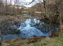The Inverarnan terminus (NN319182) was a boat turning circle at Garabal, close to the Inverarnan Inn (NN318184), now the Drovers Inn. From the basin the canal followed a near-straight southward course between the twisting course of the Allt Arnan Burn on the western side and the bends of the Falloch to the east. Following dredging the teamers could reach the old Garabal landing via the River Falloch when the water levels were high enough and other conditions such as current and wind speed were appropriate.[2][4]